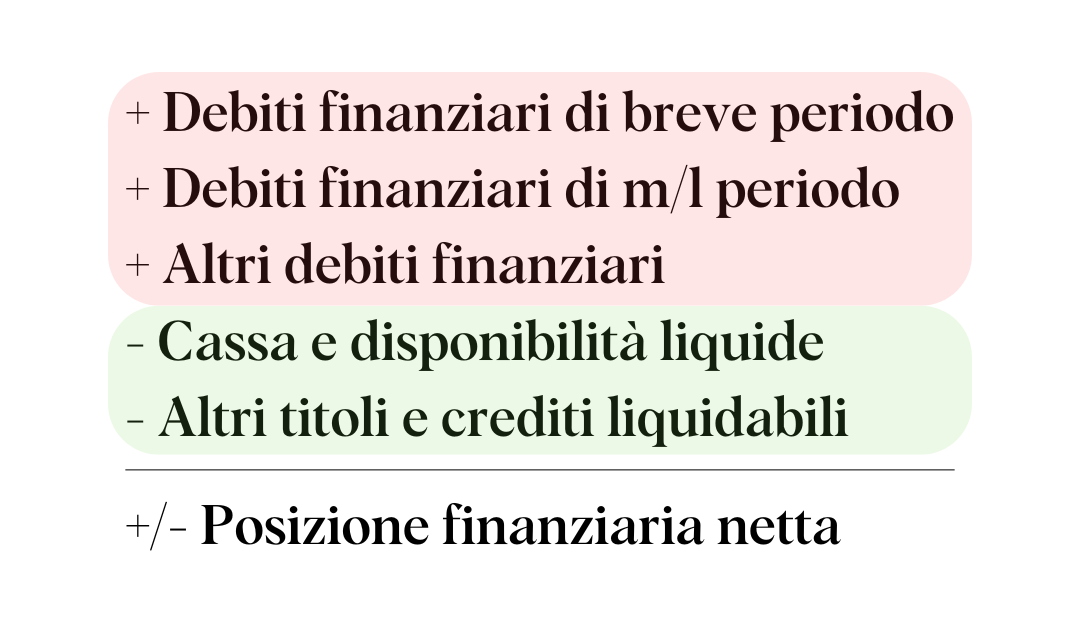 La PFN non è altro che il totale dei debiti di natura finanziaria dell’azienda (di breve e medio-lungo periodo) al netto delle proprie disponibilità liquide (conti correnti, cassa e titoli o crediti finanziari facilmente liquidabili).