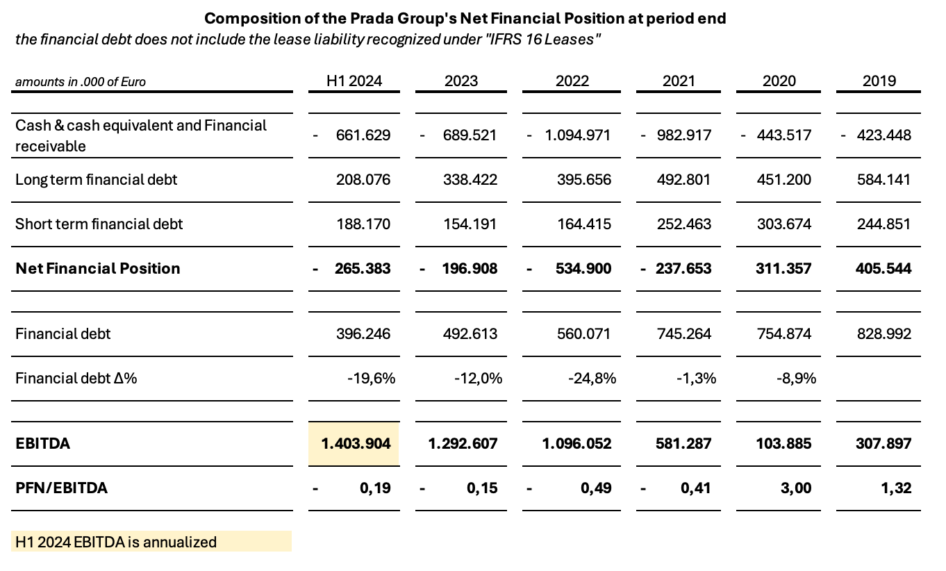 La tabella mostra l’andamento della PFN dell’azienda Prada nel corso degli ultimi anni (dal 2019 al 2023, con l’aggiunta della semestrale al 30 giugno 2024).